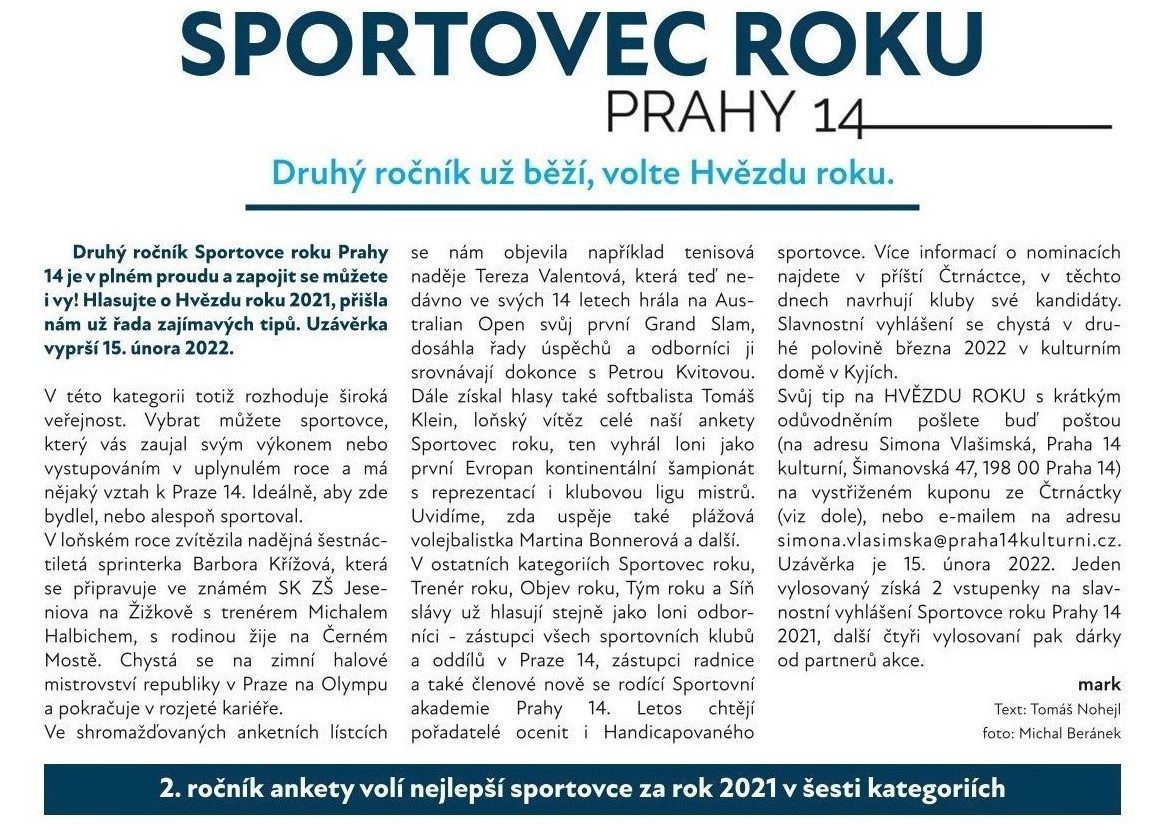 Sportovce roku Prahy 14, které proběhne jako společenská akce „naživo“, jakmile nám epidemiologická situace dovolí.